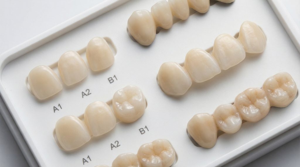 Technicians use a shade guide to identify your natural tooth color and then select a corresponding zirconia block or apply surface stains before the final firing. This ensures that the restoration doesn’t look like a “flat” white block.